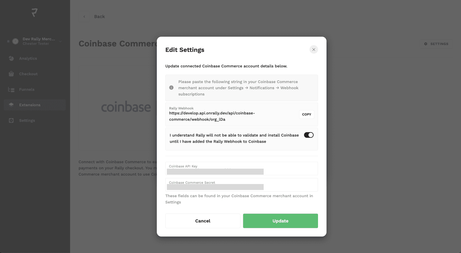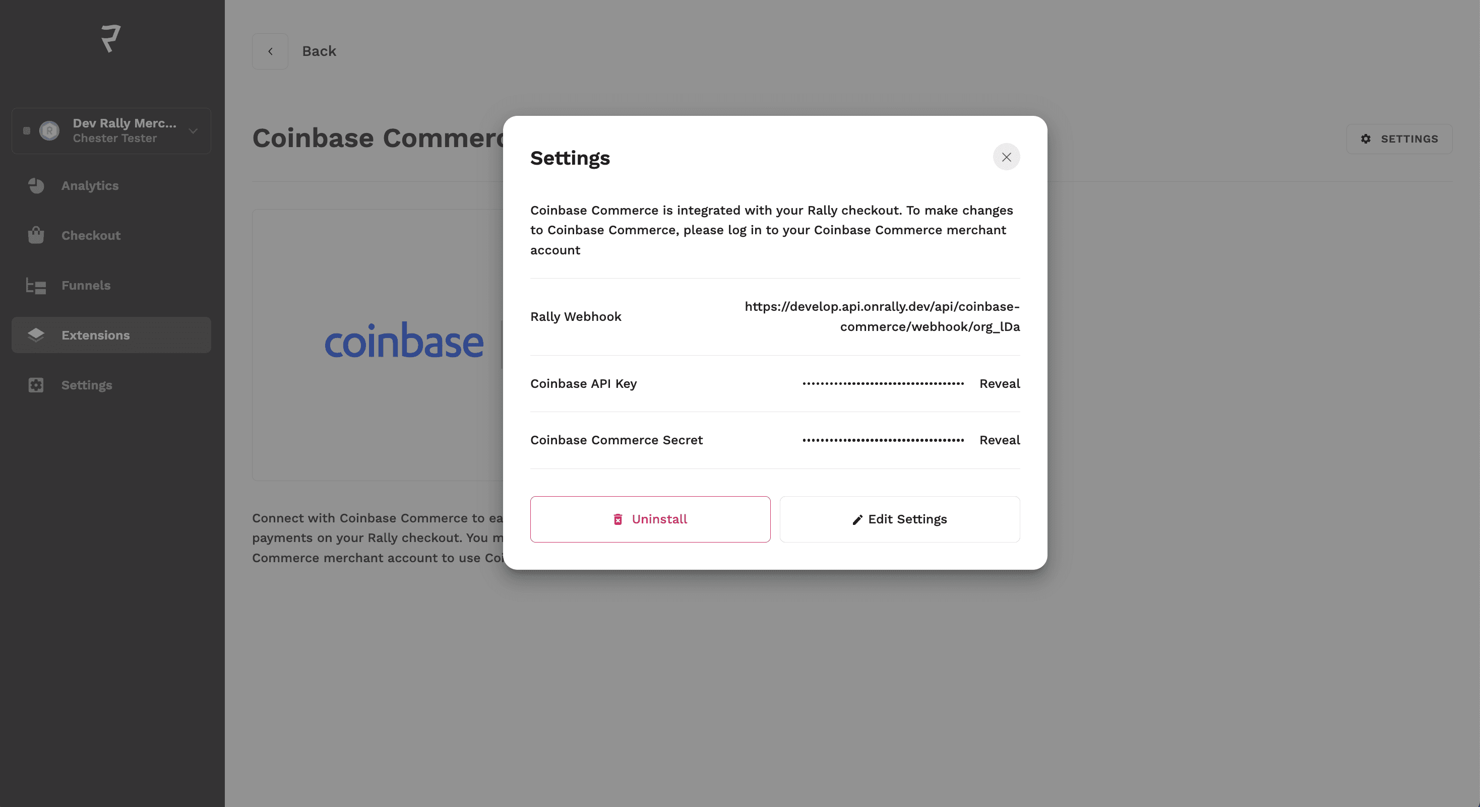 Step 1: Once you have installed the Rally checkout, navigate to the extension tab and select Coinbase.