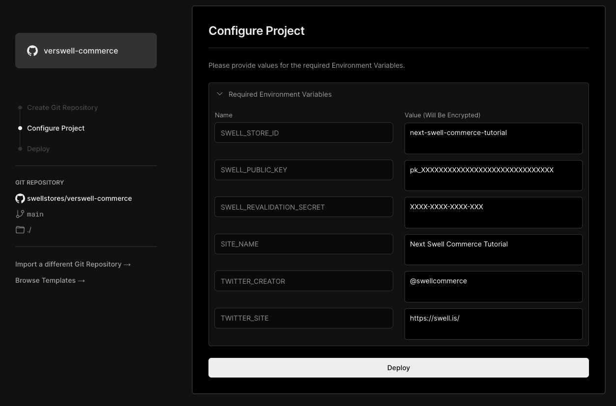 With the .env file configured with your Swell store information, you’re ready to deploy your storefront. Fill out any additional settings or configurations, and you're ready to deploy on your hosting provider of choice.