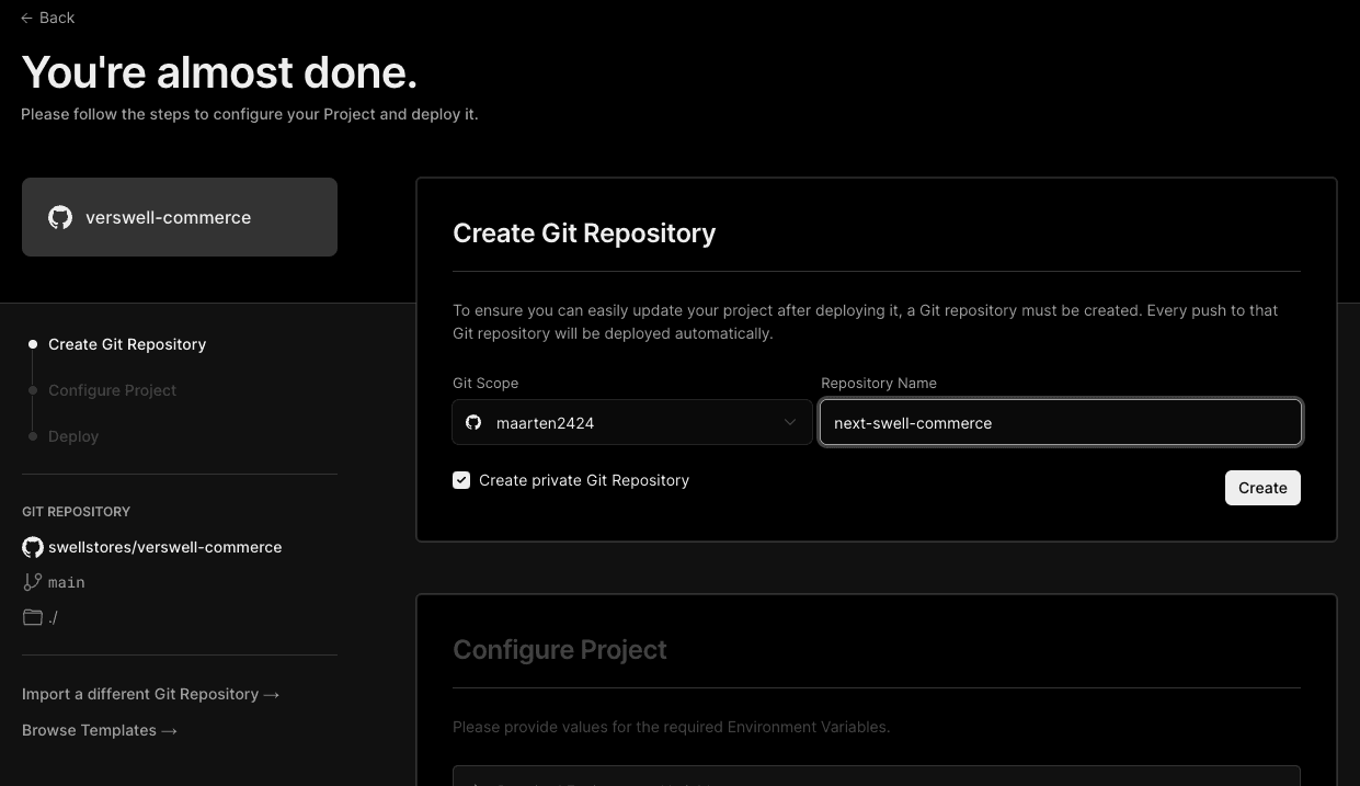 With the .env file configured with your Swell store information, you’re ready to deploy your storefront. Fill out any additional settings or configurations, and you're ready to deploy on your hosting provider of choice.